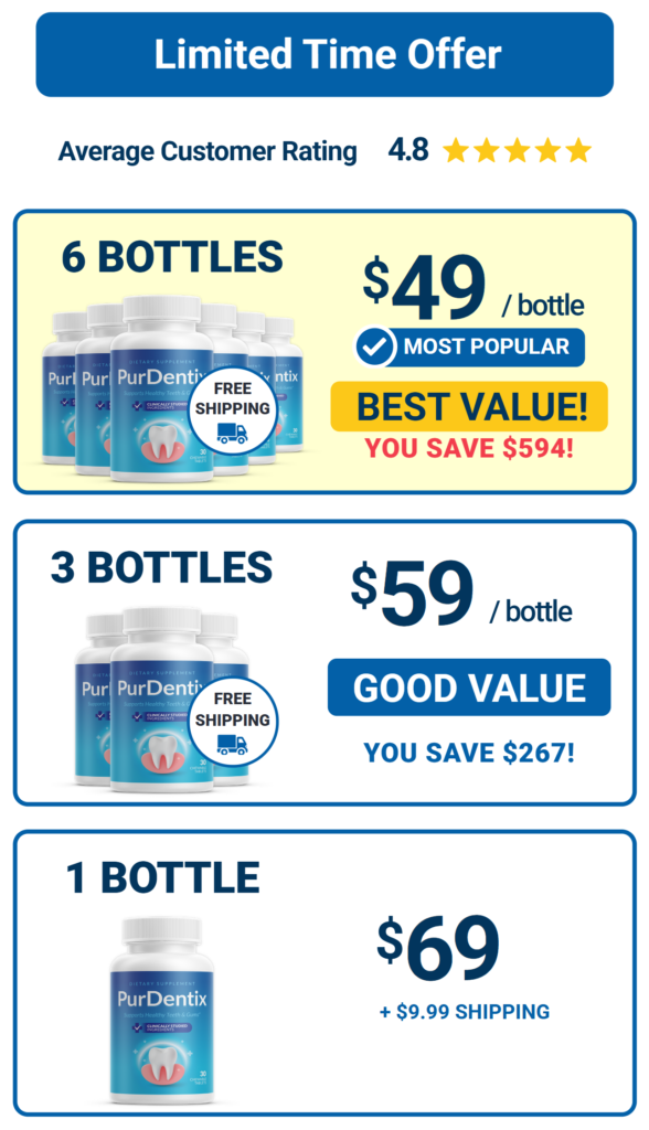 Work at Any Age: According to the official PurDentix website, it doesn’t matter “how old you are” or how long you’ve been dealing with dental issues: the supplement works on people of all ages and on those with dental problems of all levels of severity.